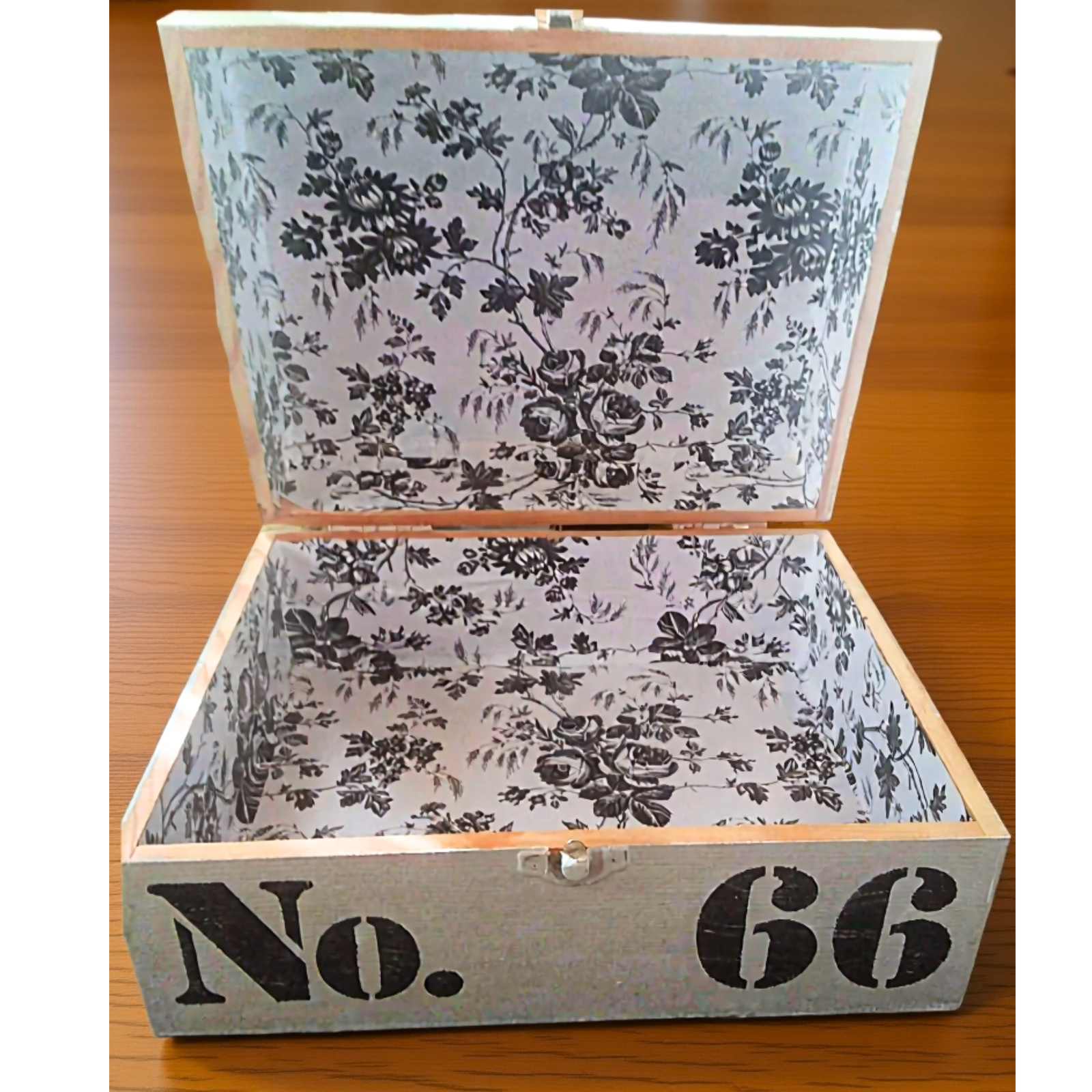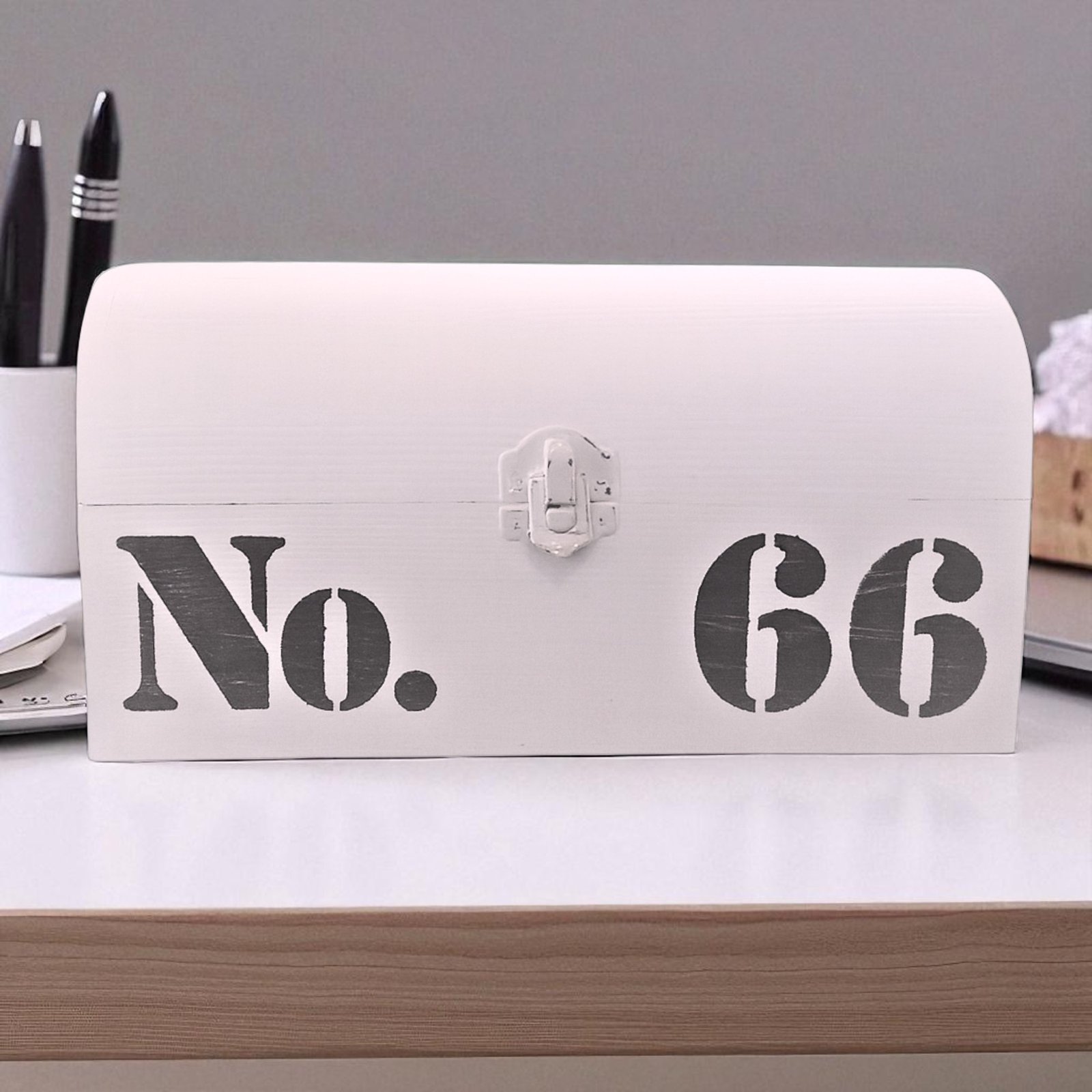 Keep your essentials stylishly organized with this white wooden storage box marked with No. 66, perfect for farmhouse décor lovers.