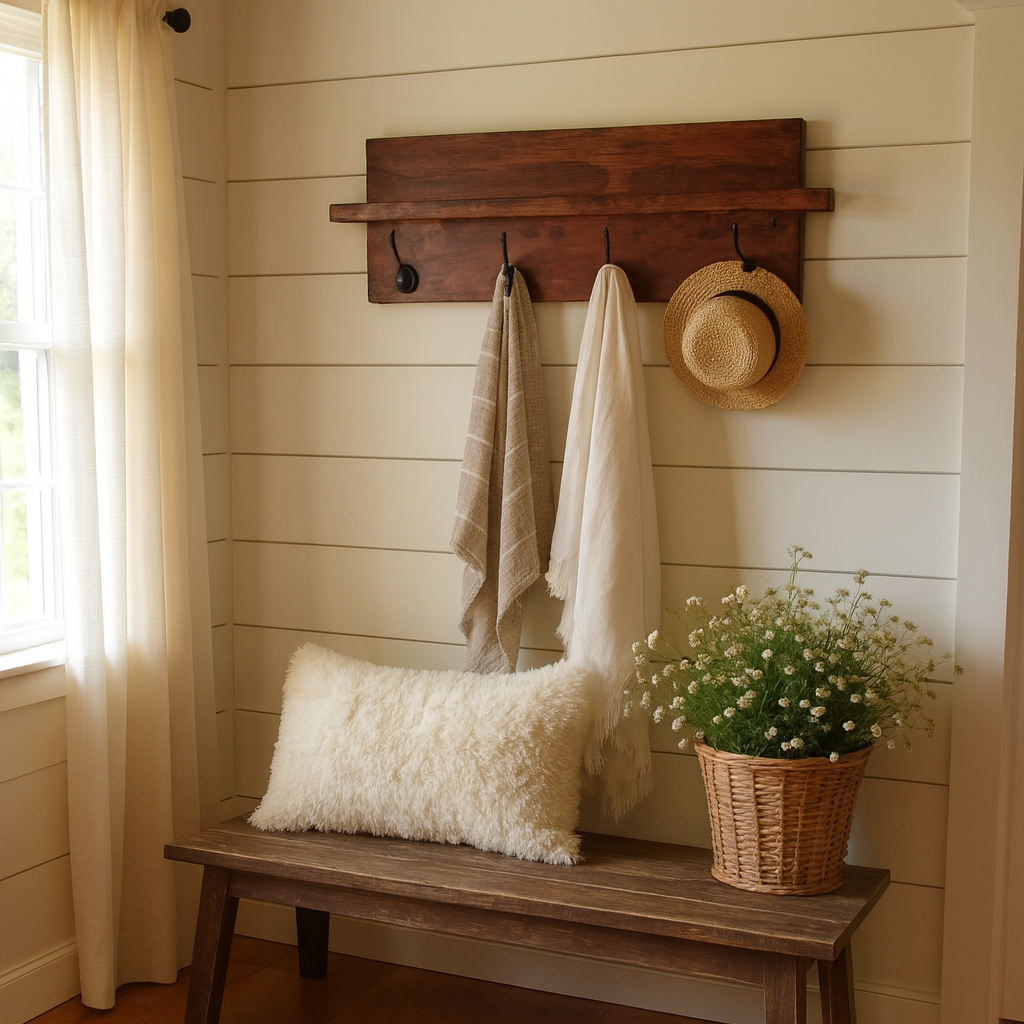 - Whether placed in your entryway, living room, or bedroom, this versatile wood shelf with hooks blends seamlessly into your décor.